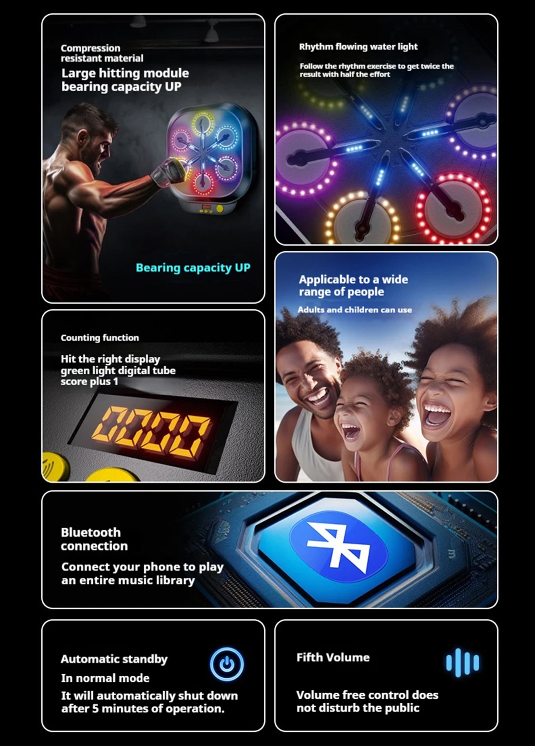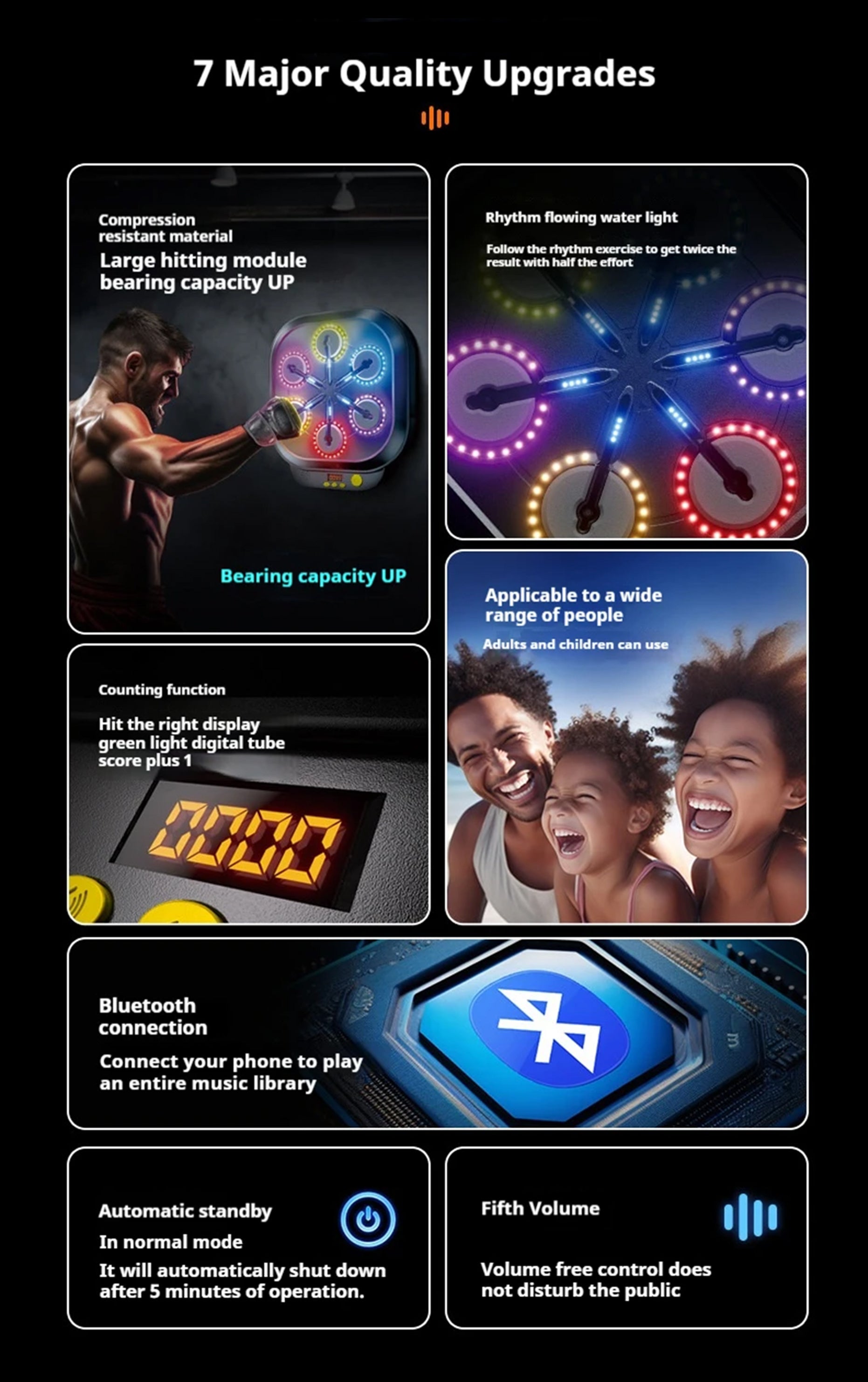 ★★★★★ The "Rhythm Master Pro Max" is a hit with the family. You punch the targets in sync with the music, and they light up, which makes it more fun. The kids love competing, and it's great for quick workouts. You can also connect it via Bluetooth to play your own music. The machine feels sturdy, and it’s a fun way to stay entertained, especially on rainy days. Riley Morgan