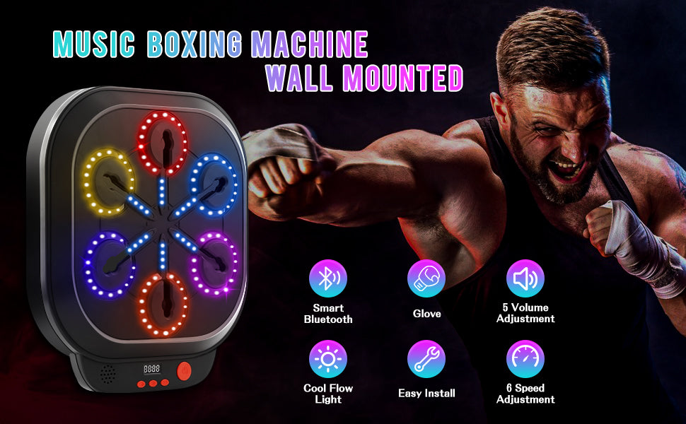 A:"To install the music boxing machine, use the included mounting hardware and follow the instructions in the user manual. Ensure the device is securely mounted to a wall that can support its weight and the force of punches."
