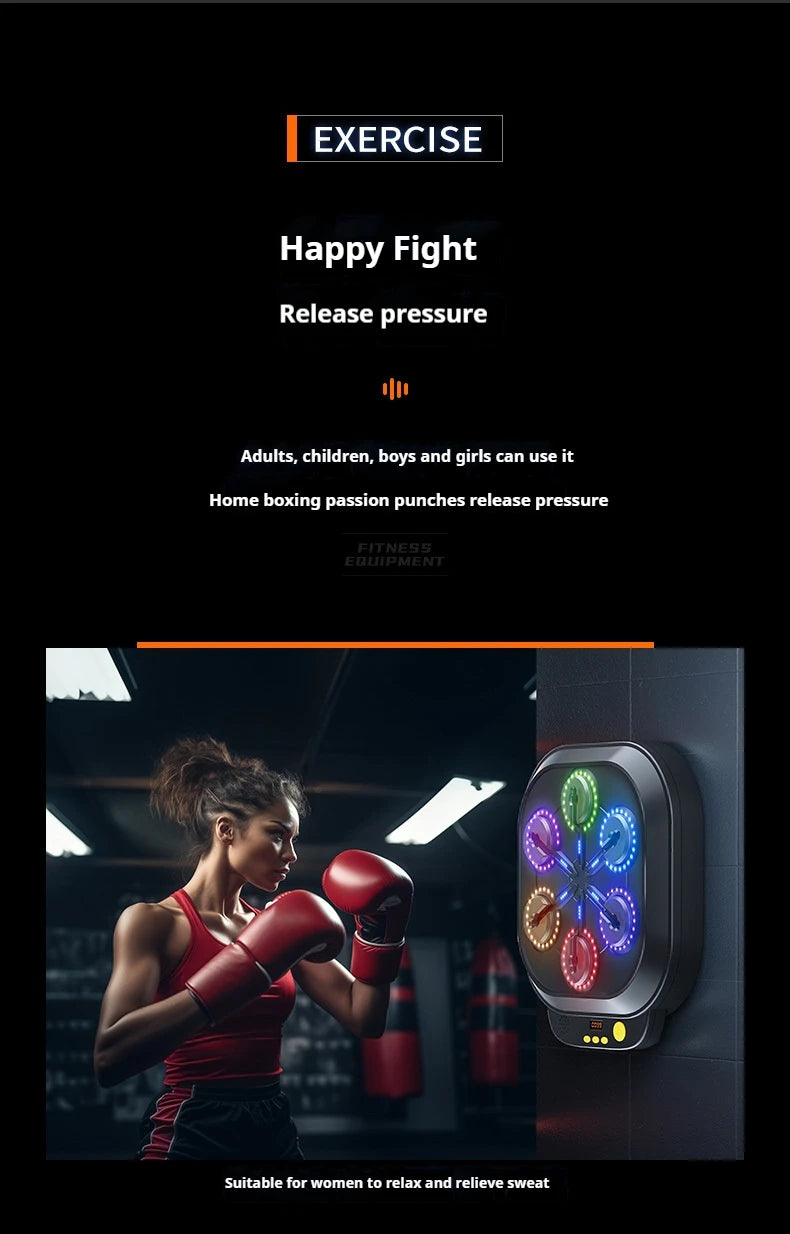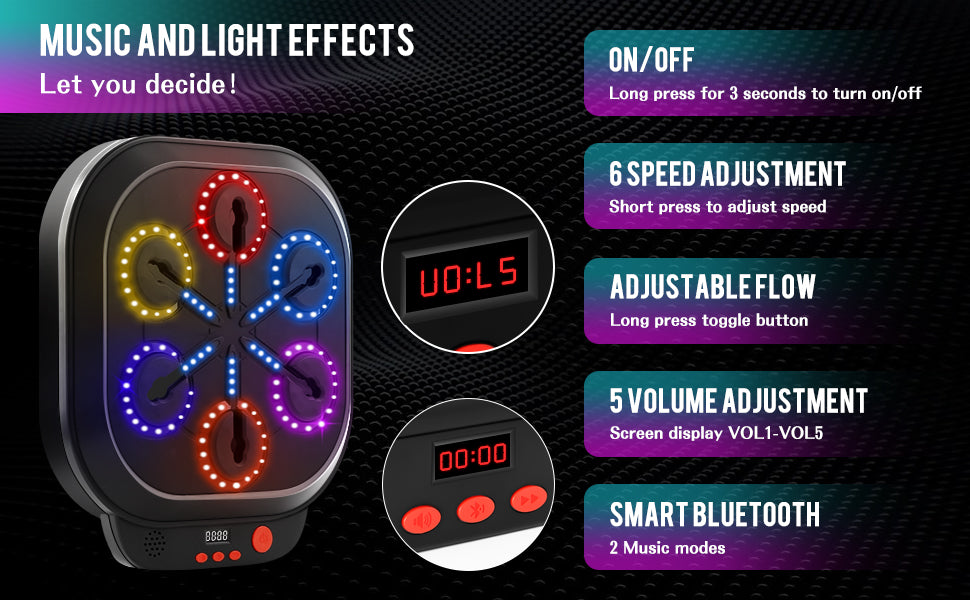 A:"The music boxing machine features interactive LED lights, Bluetooth connectivity for music playback, multiple training modes, and an ergonomic design for both adults and children. It is designed to make workouts fun and engaging."
