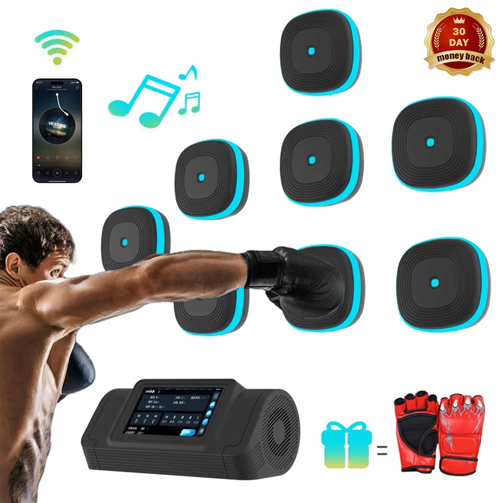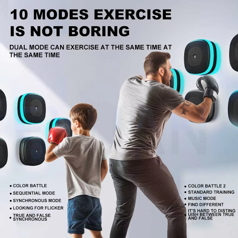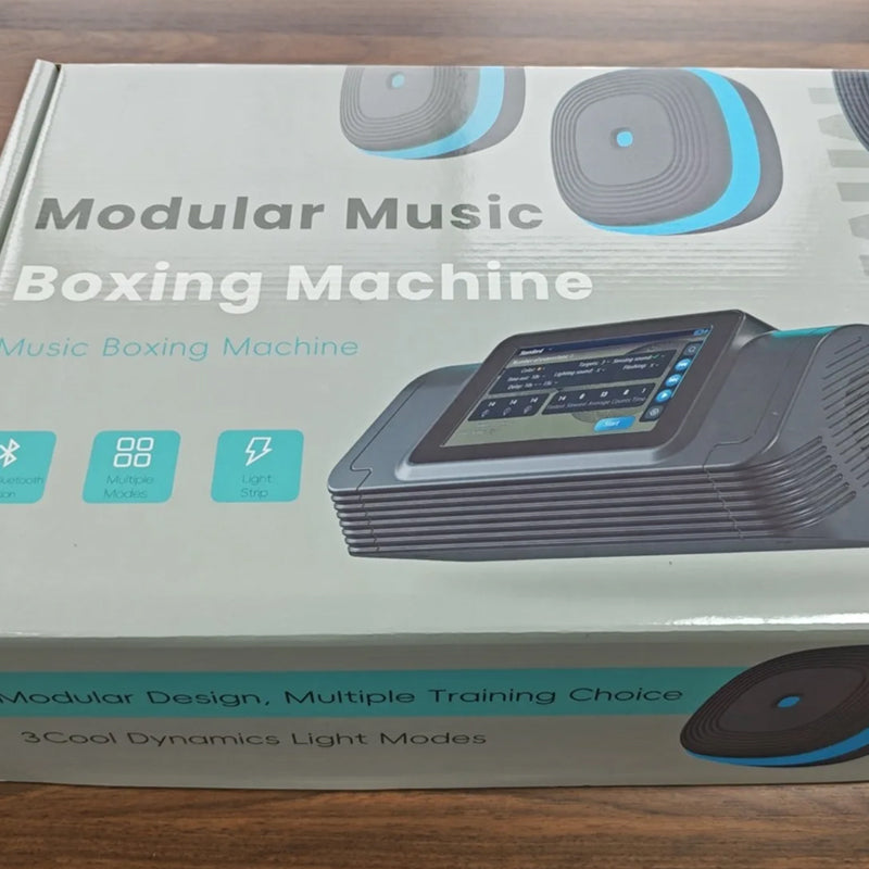 A:"The music boxing machine features interactive LED lights, Bluetooth connectivity for music playback, multiple training modes, and an ergonomic design for both adults and children. It is designed to make workouts fun and engaging."